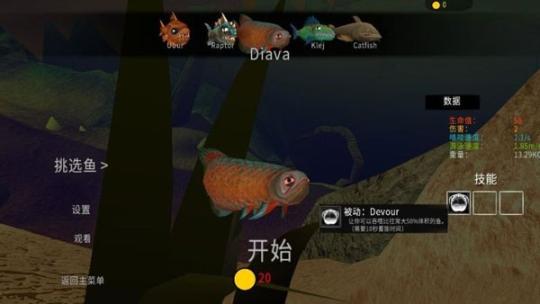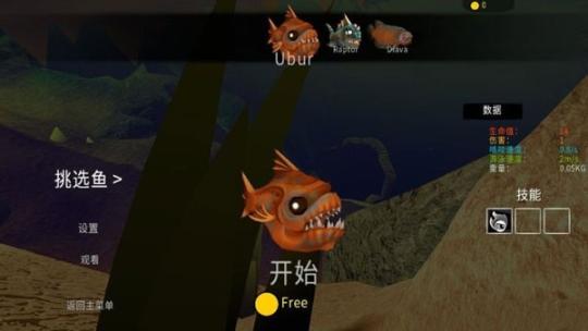 1、玩家在游戏里能够挑选各类不同的鱼类,开启游戏的冒险挑战。