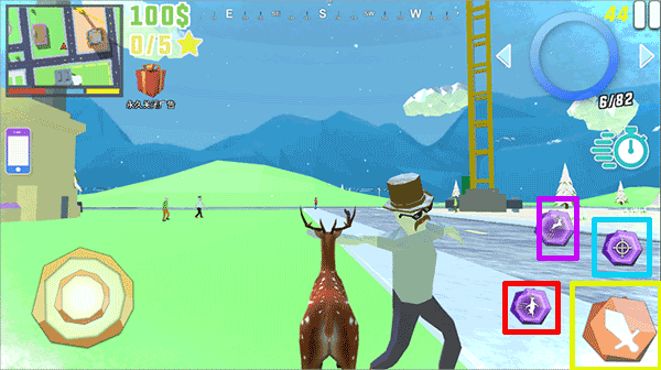 3、在这里需要注意,黄色方框内的按钮是远程攻击,红色方框内的按钮是近战攻击,紫色方框内的按钮是跳跃,蓝色方框内的按钮是瞄准。