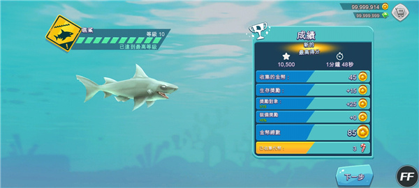 在游戏中玩家可以使用金币对鲨鱼的速度、血量、撕咬的范围进行升级,升级后可以使得鲨鱼的捕杀能力有了很大的提高。玩家在进行游戏的时候能升级就尽量的升级吧。