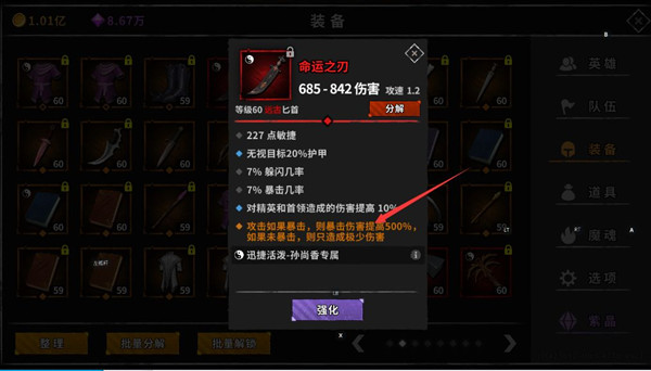 游戏内的装备主流是橙装和红装,每件装备有五条属性,就是我们说的词条,红装的五词条是固定的,而橙装的第一条和第二条是固定词条,剩下三条会随机。每件红装下面都会有一个大词条,这个红装的大词条可以转移到红装或者橙装上面,而大词条只有红装上的大词条可以转移,大词条转移到橙装上面后,不可以再转移。而装备的小词条则可以用陨铁来进行调整,每件装备可以调整一条小词条,每个部位可能调整出的词条都略有不同,在调整装备的时候可以看到可随机到的词条。