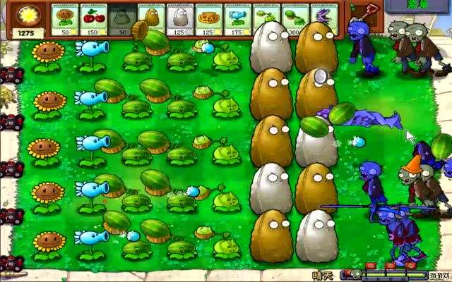 然后用高坚果挡海豚僵尸,继续种南瓜套,架上玉米大炮,种地刺。地刺完成,种忧郁菇,继续玉米大炮。等都种植完成了之后,最终布局也就完成了,然后就能通过此关。