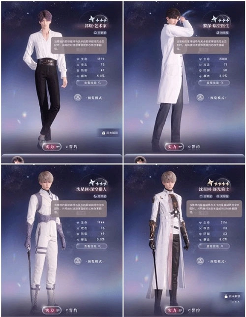 以沈星回为例,对比五星“逐光骑士”与四星“深空猎人”套装,“逐光骑士”的基础属性面板更高。