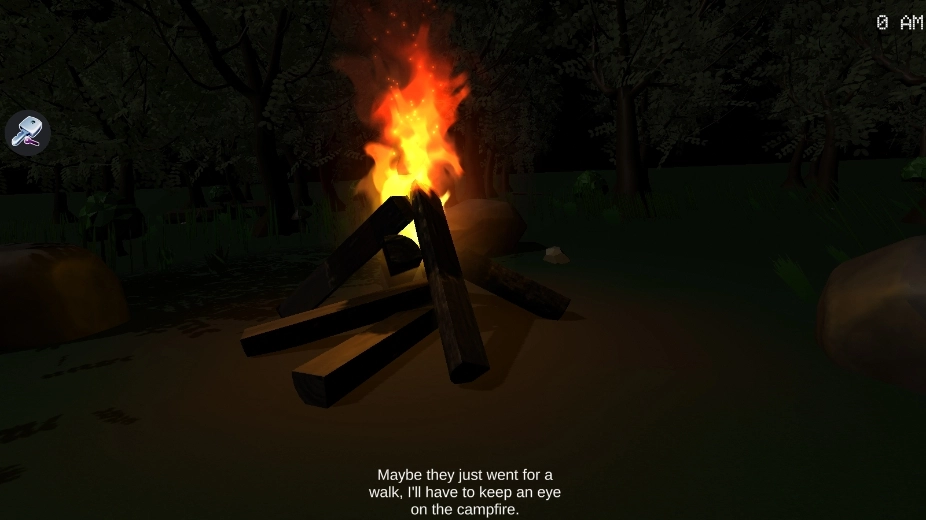 你与朋友一同在森林中徒步旅行,夜幕降临后,却迷失了返程之路,于是你燃起了一堆篝火。可在篝火燃烧之际,你竟不知不觉睡着了,待你醒来,朋友们已惨遭杀害!显然有人对他们下了毒手,而如今,这个凶手正将目标对准你!务必小心,绝不能让篝火熄灭,一旦熄灭,凶手便可能趁机发动攻击!你已经发出了求救信号,然而不幸的是,救援尚需漫长时间才能抵达。救援人员要在五个夜晚之后才能找到你!在此之前,你必须每晚都小心翼翼地维持篝火燃烧,还要不断寻找树枝来添柴。你,能否平安熬过这五个夜晚呢?