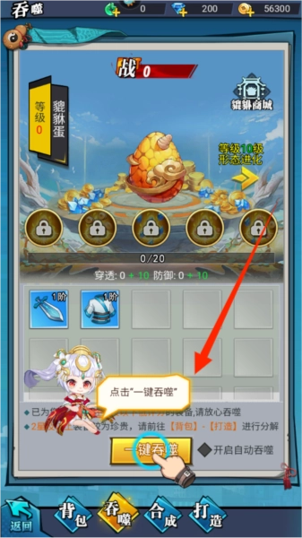 3、进入吞噬界面,点击一键吞噬,消耗材料,提升灵宠等级,助力后续冒险。