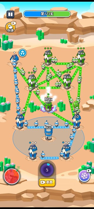 开局只有一座塔的关卡,要依据地图选定进攻位置,优先攻打防御兵塔。防御塔无论是当作后勤保障还是用于主动进攻,表现都很出色。等内循环状态稳定下来后,就去攻击敌方的薄弱之处。在塔还没升到满级时,各个塔之间可以互相出兵;一旦塔满级了,就要减少出兵的线路,这样能降低吞兵的情况,从而增强进攻能力。当战场只剩下一条进攻路线时,进攻的威力是最大的,而分兵策略只适合在塔未满级以及塔的数值会下降的阶段使用。