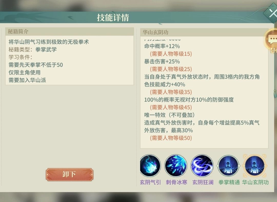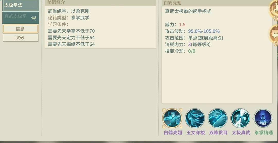 最强武学:两仪折峰手(南山门派无法抽取,八大门派和华山门派可以抽取,0突破时解锁即为最强状态,继续抽取属于浪费珠子)