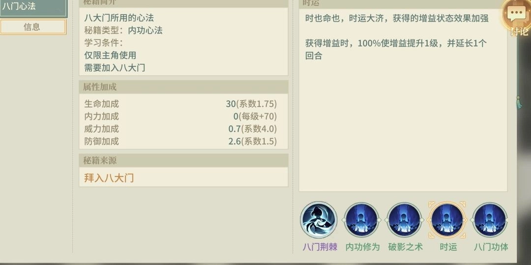 另外两个武学的选择可以根据自身资源情况来定,优先考虑参研后能提升生命值的。如果资源比较充足,直接采用巫教秘阵那种炸盾的配置就行,我自己没带这套也顺利通关了。