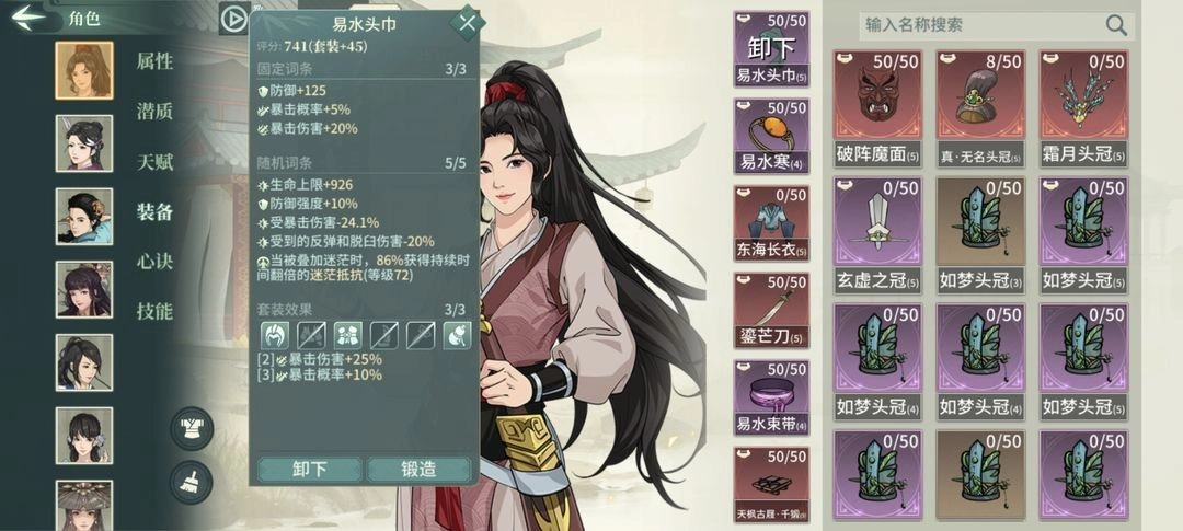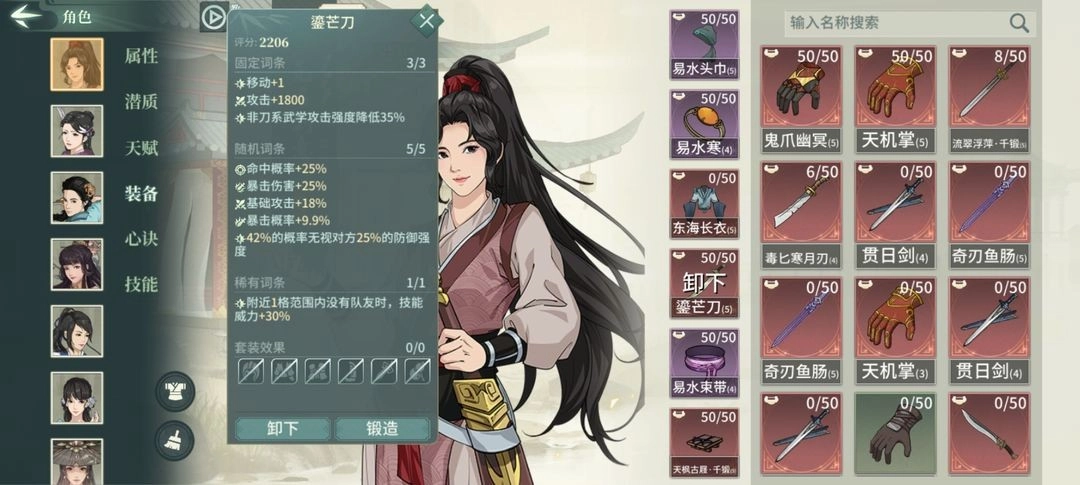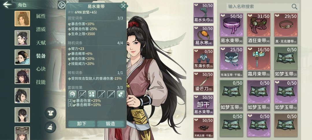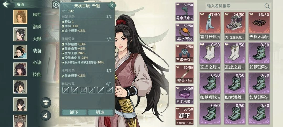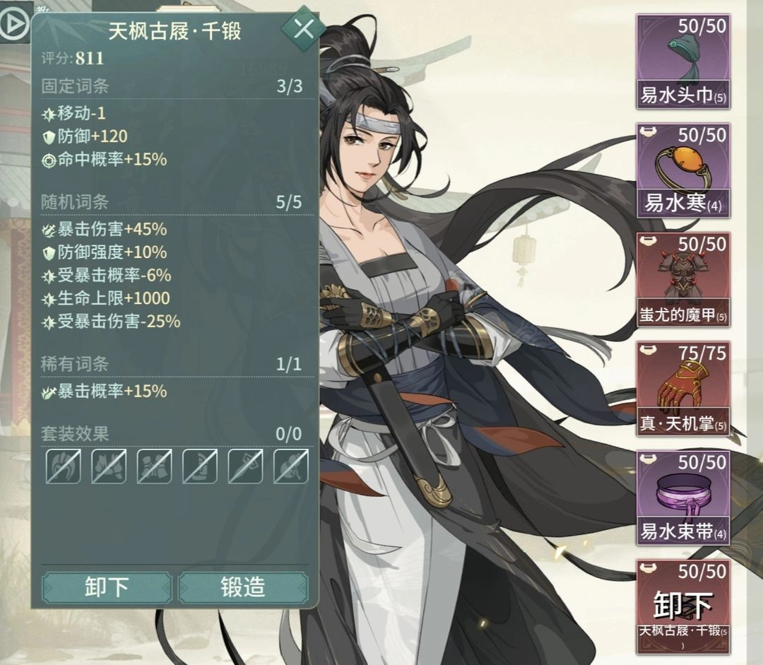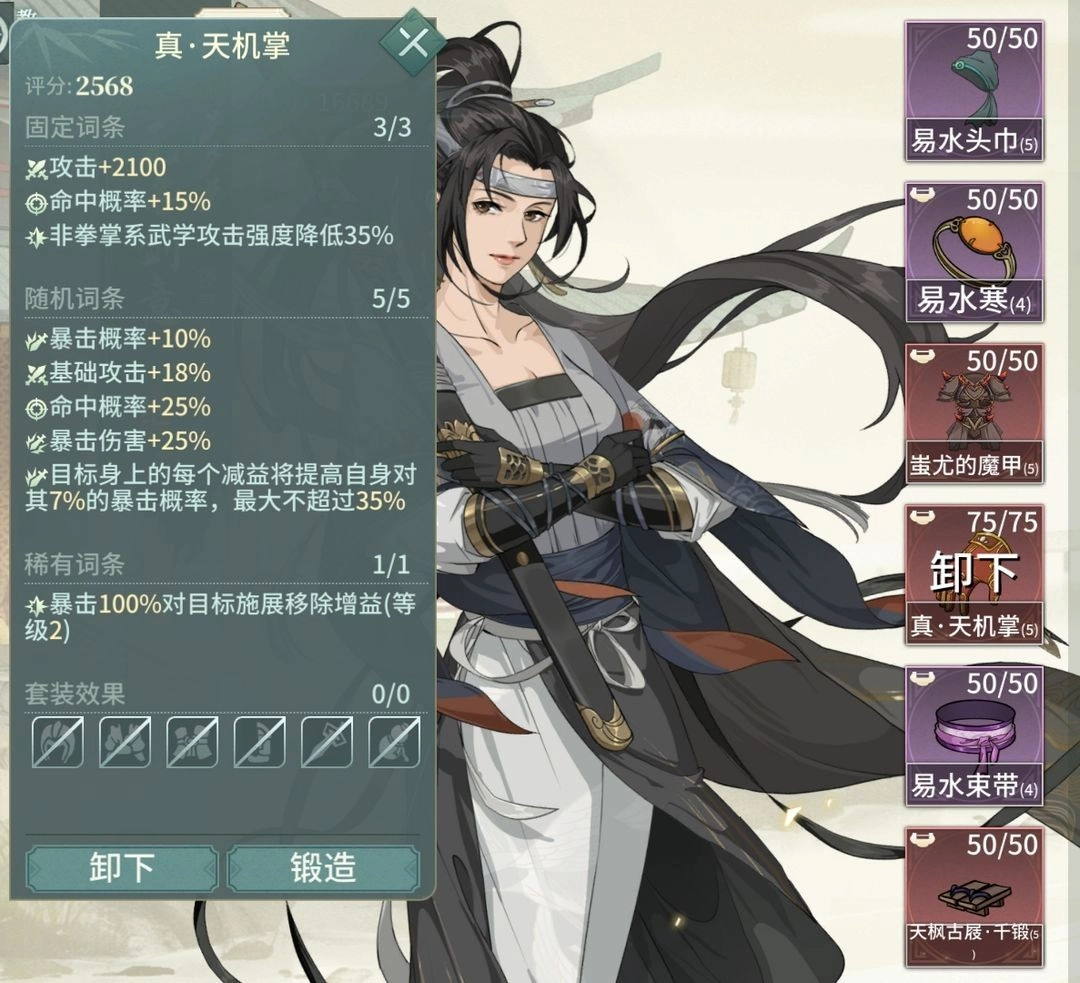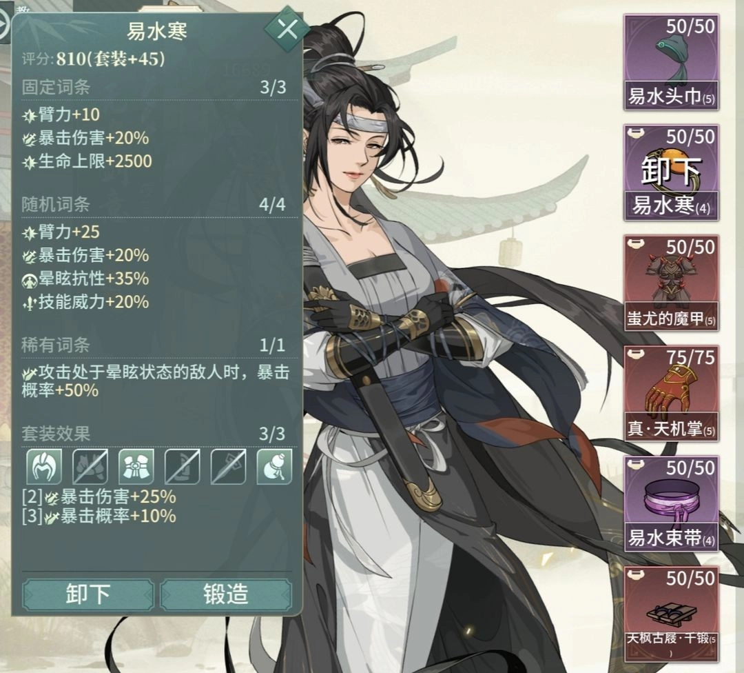提升玉佩、衣装、鞋履与兵器的稀有度需通过合成逐步达成,在此过程中建议控制重铸石的消耗,优先将资源投入到头饰与腰饰的养成上。