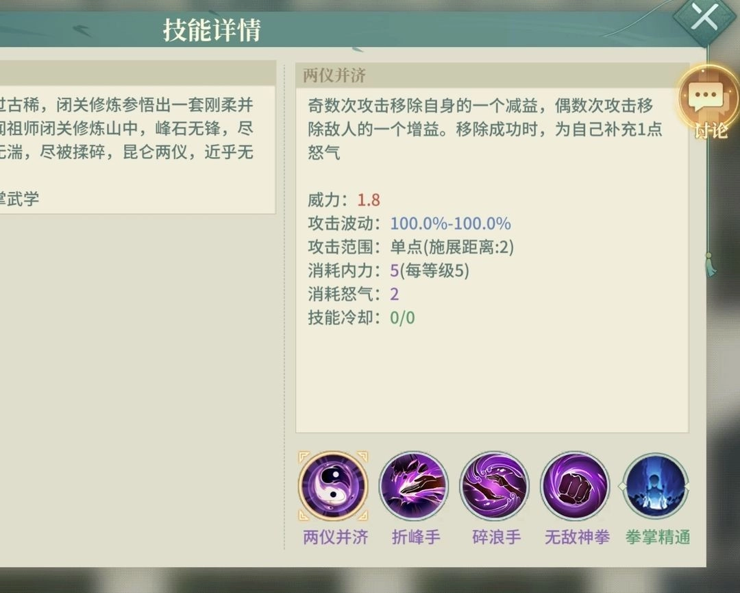 这里补充说明一下墨子悲丝这个武学,其实存在一个常见的认知误区:有人觉得墨子悲丝2.1的平砍伤害是所有武学里最高的,那它是不是真的很强?答案其实挺让人无奈的——这套武学总共就两个技能,其中一个冷却时间长达15回合,这就意味着实战中基本只能靠平砍输出;更关键的是,它的普攻居然不回复怒气,这才是最致命的问题,也注定了它会被淘汰。毕竟低资源玩家通关副本的核心逻辑,是要能频繁释放技能,而这离不开稳定的怒气供给(比如南拳就因为技能不耗怒气,容错率才高)。没有怒气支撑的武学,很难在低资源情况下正面打过副本,除非是八大门易容、炸盾流这种特殊机制的玩法。
