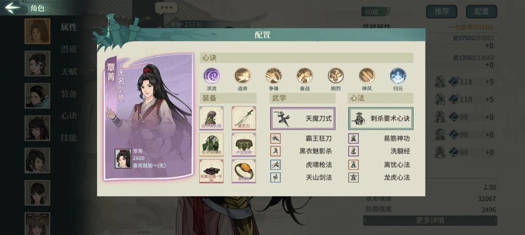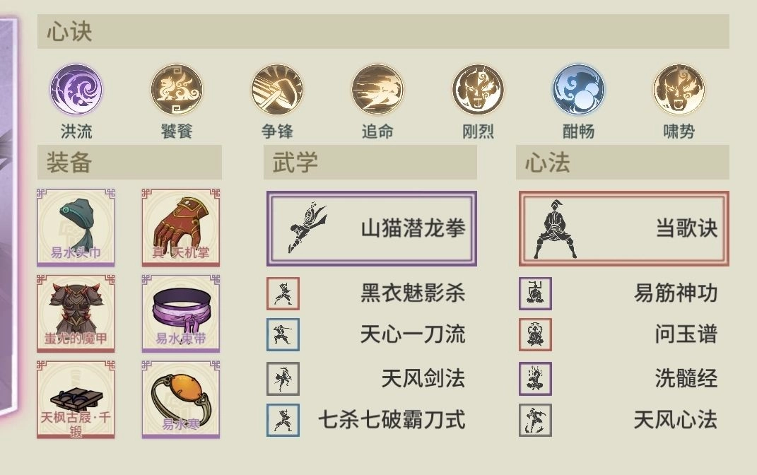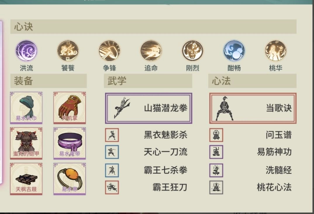 第二步:心诀升级需遵循特定顺序,优先提升“争锋”,其次是“洪流”,接着为“饕餮”,然后是“追命”;另外“酣畅”的优先级高于“刚烈”,最后是“桃花”。