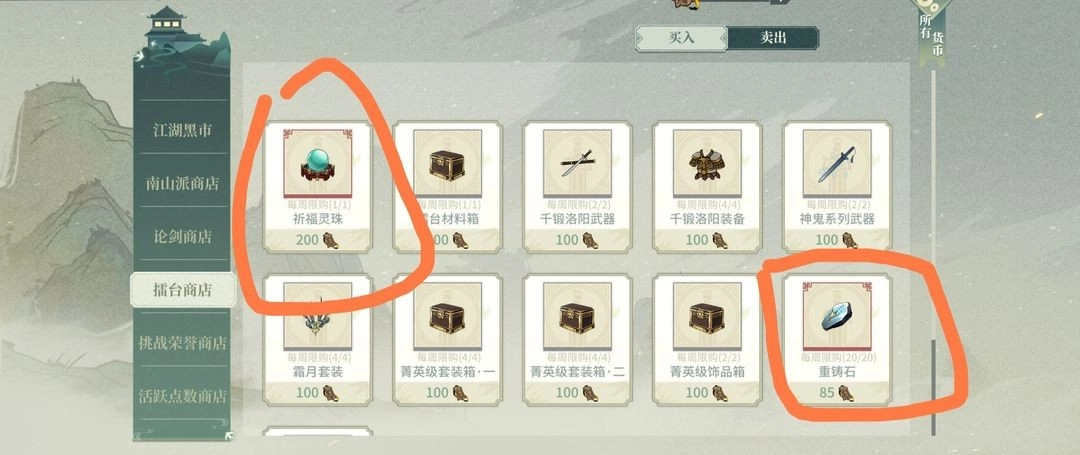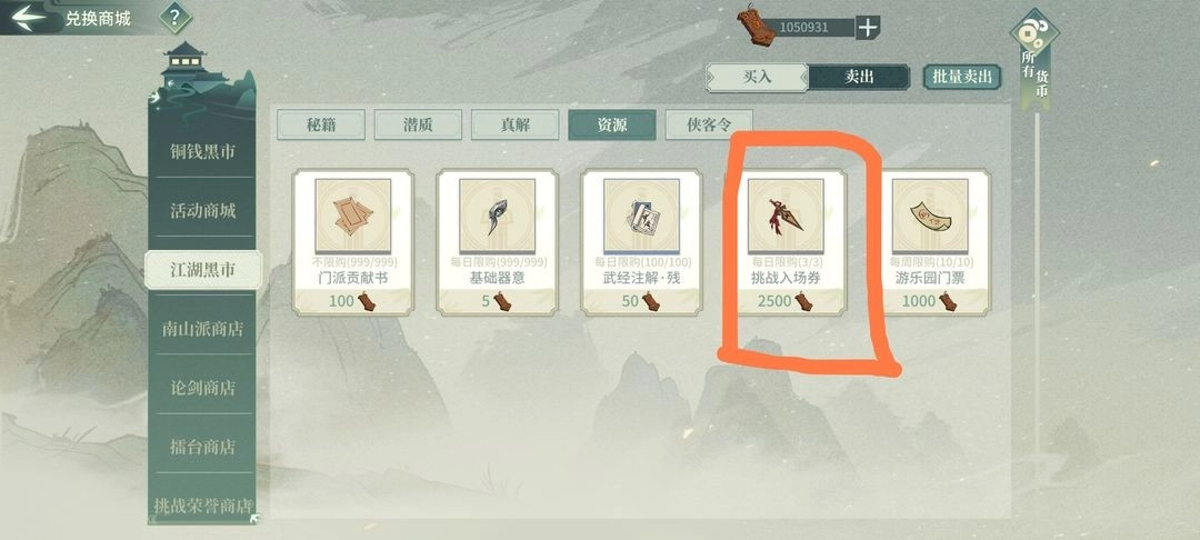 在江湖的隐秘交易场所,建议优先用江湖贡献换取武学秘籍,待武学相关物品全部兑换完毕后,每日务必购置三张挑战凭证。