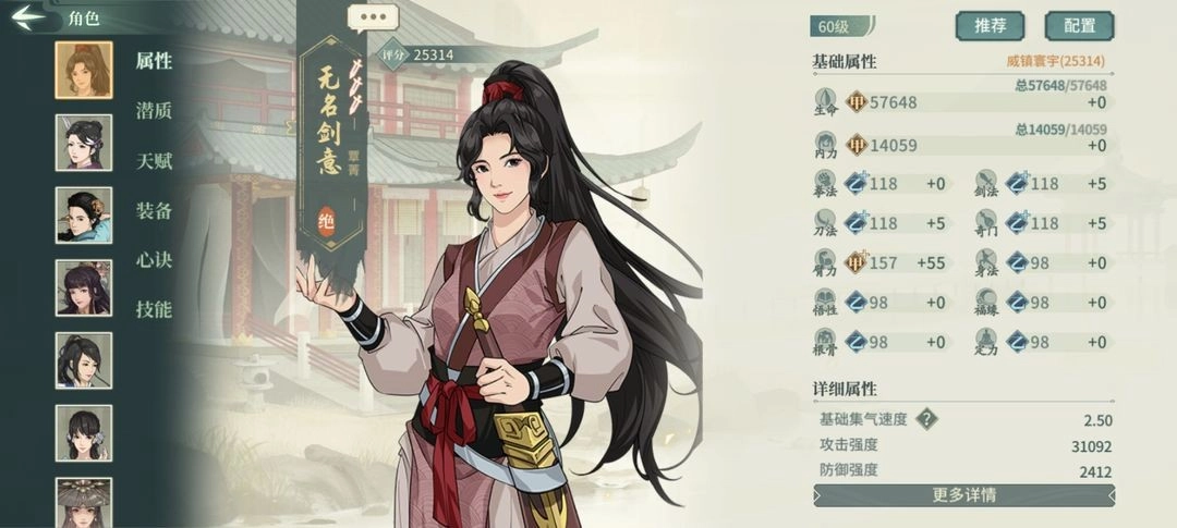 戒指选根骨,腰带选悟性,现在这两项属性都是00,等满突破后补上轻身和清心诀。这是属性强迫症玩家的配置。另外搭配夸父心诀还能防范耶律清的怒招,技能衔接会更流畅。