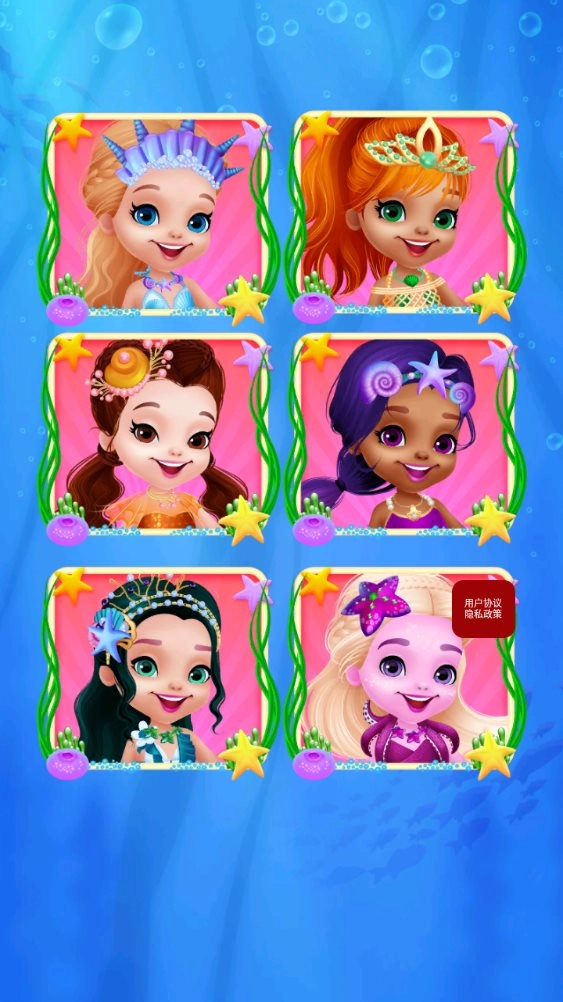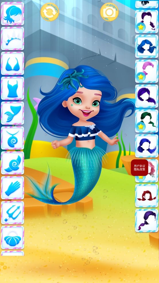 1、通过触摸点击选择衣服、耳环、头饰等饰品,能够更换人鱼公主的装扮