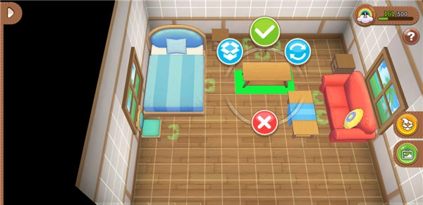 进入房间后,点击右上角的“装潢”按钮可进入布置模式,此时长按任意家具1.5秒,即可对其进行移动、旋转、收纳或摆放操作。每件家具都有对应的占地面积,只能放置在显示为绿色的区域;同时,像椅子、沙发这类可供角色坐下的家具,还需考虑人物的站立位置。若摆放时发现家具底部明明显示绿色却无法放置,说明该家具本身或周围的家具没有留出足够空间供角色交互,需要微调位置,直到出现绿色足迹提示,才能成功放置。