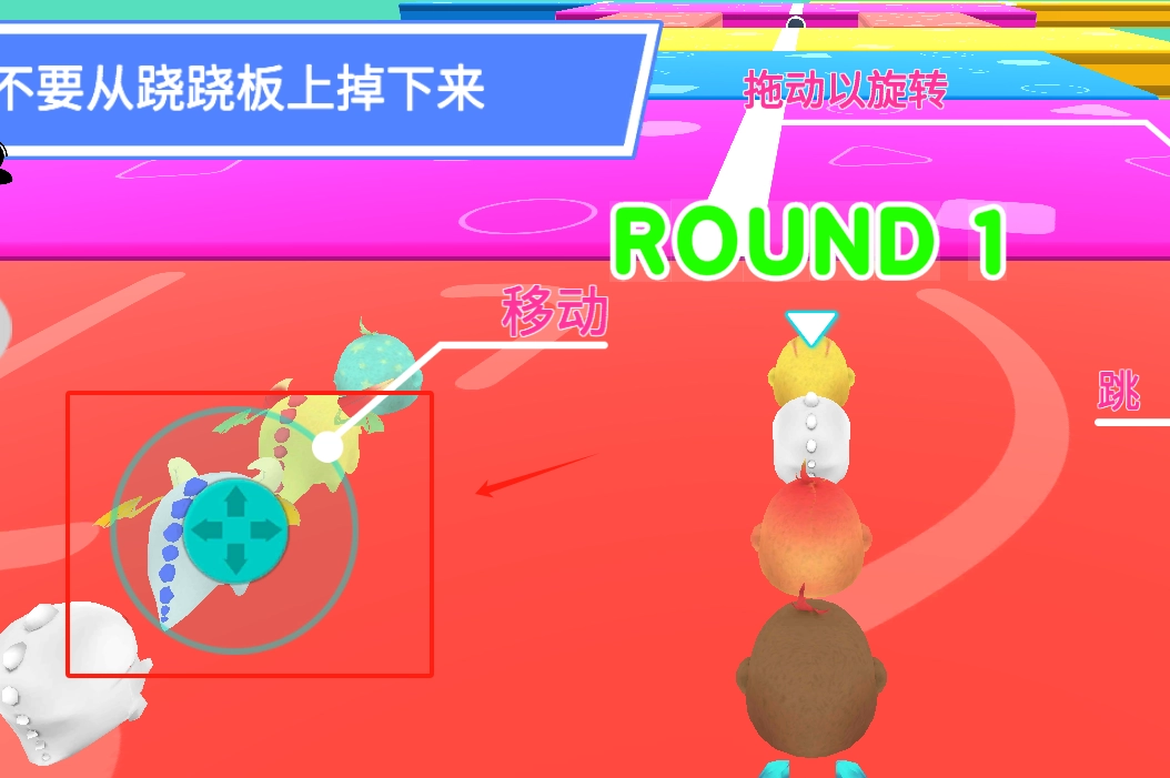 2、按提示拖动角色旋转跷跷板,左侧移动右侧跳跃,避免从板上掉落。