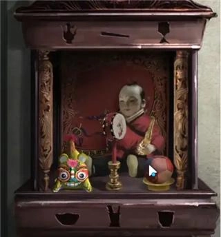 11、返回化妆间,将布偶放化妆间的神台,得到道具房里面坐上架子物件摆放的提示。