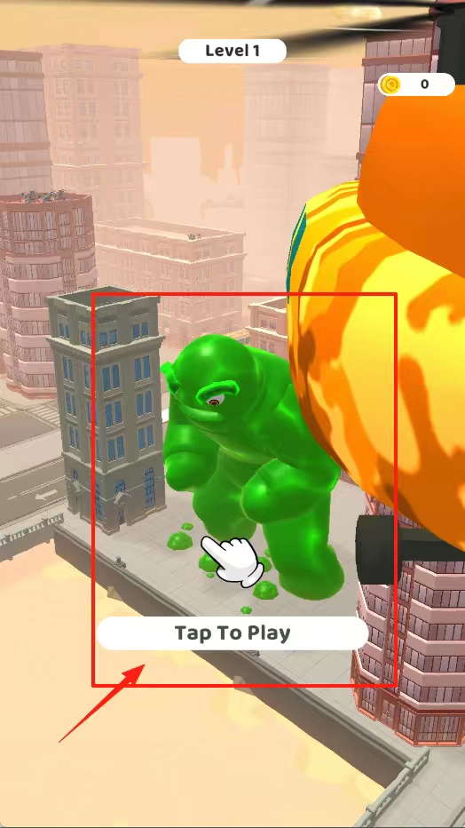 1、先点击中间的“Tap To Play”按钮,游戏便会启动。此时你会看到绿色怪物与城市背景,这里就是战场了。