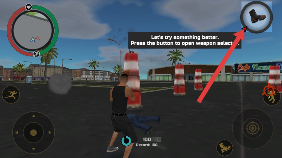 2、切换武器,按提示点击右上角按钮打开武器选择器,选用更高效的武器如枪械,提升战斗能力。