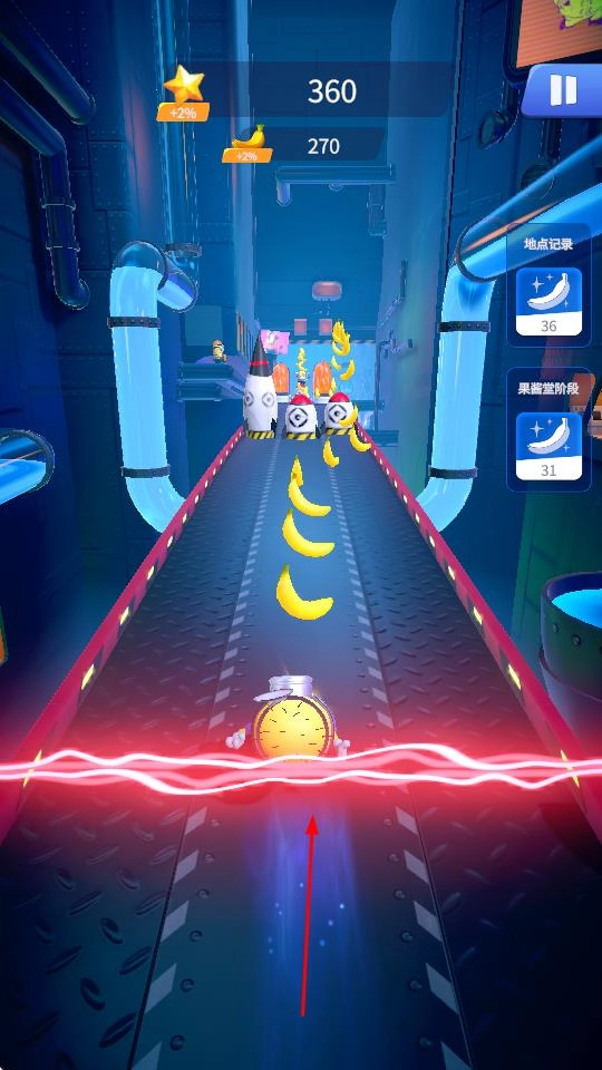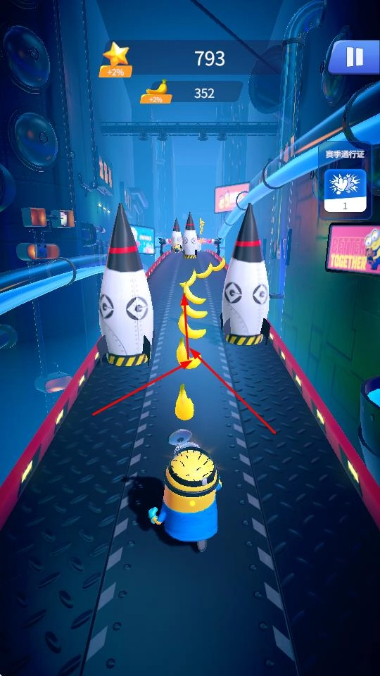 2、遇到火箭等障碍物时,及时调整小黄人的位置,避开障碍,避免游戏结束,持续在跑道上前进。