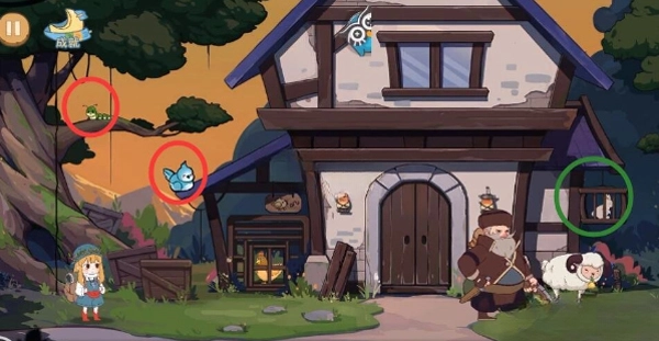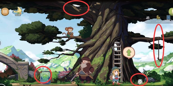 之后走到树下把剪刀捡起来,接着爬上梯子把绳子剪断,这样钥匙就会掉下来,羽毛也会跟着一起掉落。