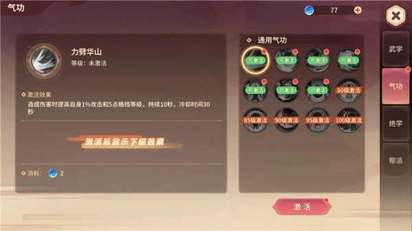 1、每个江湖都有其独特的武功秘籍,而在再见江湖中,玩家将发现四大武学类目:武学、绝学、气功、帮派。无论你是喜欢快速攻防,还是追求力量,这里都有你所需要的武学技能!