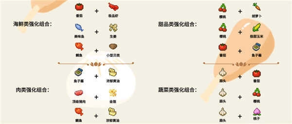 5、每道菜品依据自身的风味特点与所属品类,都存在最适配的强化食材,这部分内容需要大家在日常实践中慢慢积累和摸索,此处仅列举一些较为通用的例子供大家参考。