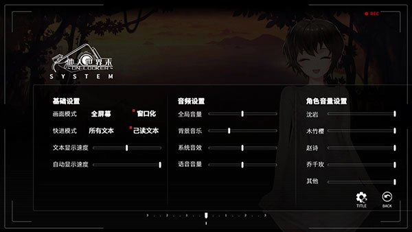 8、点击【CONFIG】按钮可进入游戏的全局设置界面,在这里能找到基础设置、音频设置以及角色音量设置等选项。