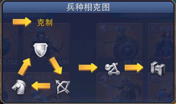 各兵种之间存在克制关系,同属性下克制能力超过10%。步兵克制弓兵、弓兵克制骑兵、骑兵克制步兵、步骑弓同时克制攻城车。