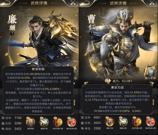 如果不准备买廉颇,就要优先养成曹仁,后期可以根据阵容需要选择“曹仁+司马懿”或者“曹仁+周泰”。前者承伤能力强,后者可以为部队提供一些属性增益。