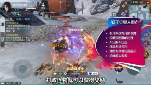 2)该妖怪出现时会触发系统通告,同时在对应地图上标注出其具体位置,玩家可通过寻路功能前往并与之对话,击败妖怪即可获得奖品。其出现时间和地点同样不固定,比较适合游戏时长较多的玩家。由于奖品十分丰厚,参与抢怪的玩家数量众多。