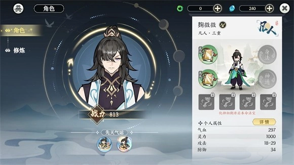 4、点击右下角的角色按钮可以搭配各种功法和提升自己的境界。