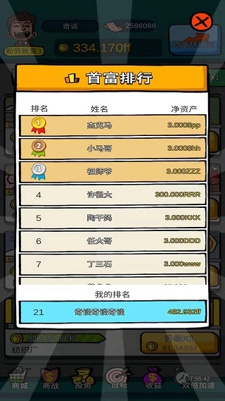 除了常规的经营玩法外,游戏里还能向其他行业的大亨发起挑战,通过争夺项目实现人生逆袭,不断突破自身极限,最终登上首富榜首,完成对其他公司的收购。