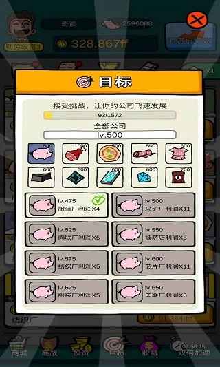 在这款游戏里,玩家的核心目标是积累高达10亿的财富。从最初创办养猪场、肉联厂、披萨店等基础产业,到逐步进军石油、珠宝等高端领域,整个过程能让你真切感受到经商的艰辛。而且,每成功开办一家新公司,系统都会发放相应的资金奖励。