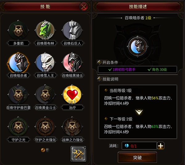 (1)召唤系技能:召唤哥布林、召唤石巨人、召唤暗杀者、召唤雪人王、召唤暗黑骑士。