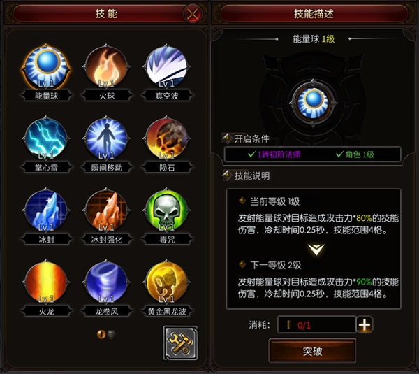 (1)初期技能:能量球、火球、真空波、掌心雷、陨石、火龙、龙卷风、黑龙波。都是在刚进入游戏时学习的技能。技能虽多,但是日常使用以陨石和黑龙波为主。
