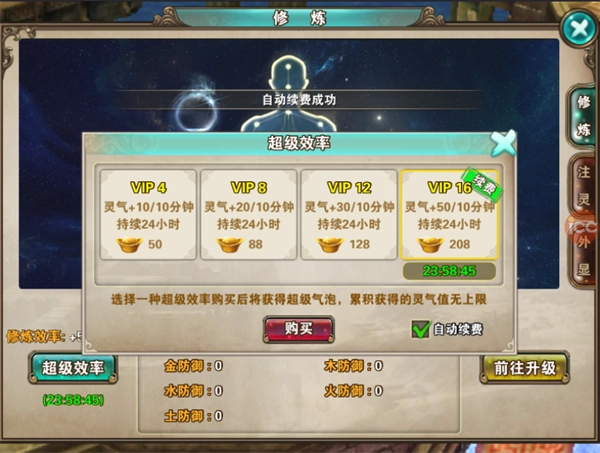 可按自身需求勾选自动续费,当超级效率时间失效时系统会自动扣除元宝续费。