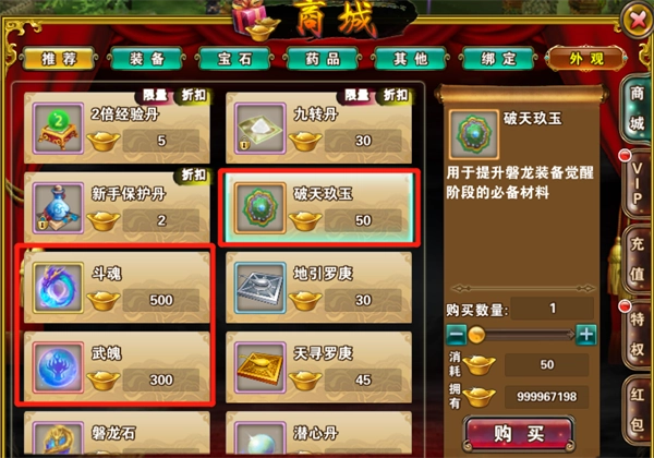 3、破天玖玉,武魄,斗魂都可以在商城中购买。