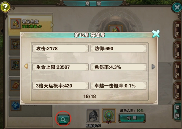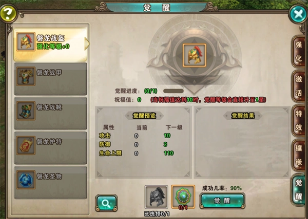 通过觉醒进行升星,每5星需要进行突破,突破后可继续升星,最高可觉醒到15星。每次升星会提升基础的攻防血属性,每次突破会增加特殊属性。更换磐龙装备不会改变该部位的觉醒等级。