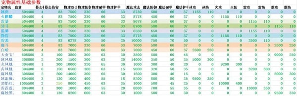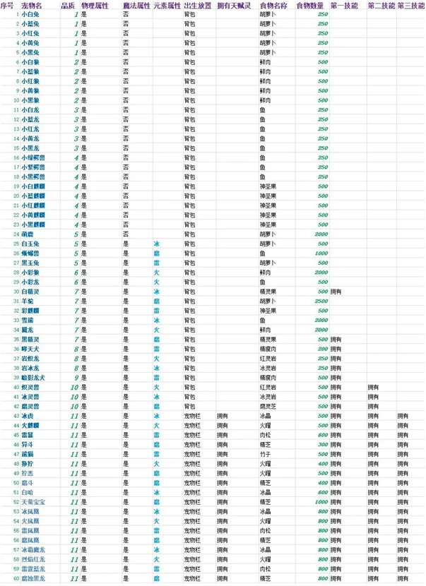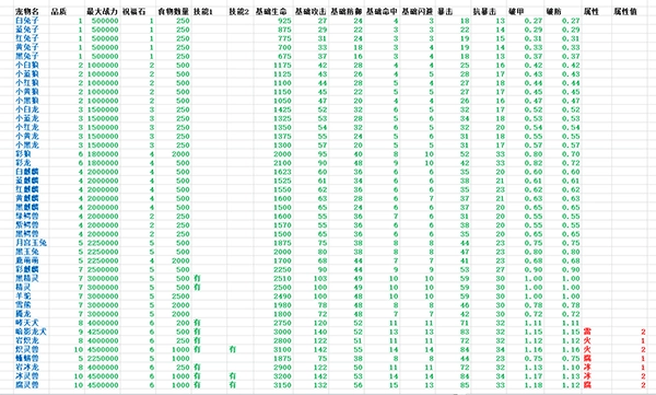 1、宠物出生的基础1等级,0成长时的属性如下表。