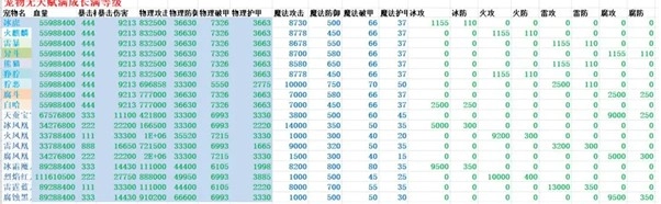 3、宠物无天赋满80级,吃东西满成长,满魔法丹 属性如下表。