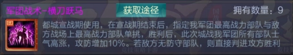 战术思路:该战术能让己方军团所占领的某座城内所有守军(含成员部队及城防军)在使用后的十分钟内伤害增加30%,强化己方防守能力,且不会随着停战而失效。