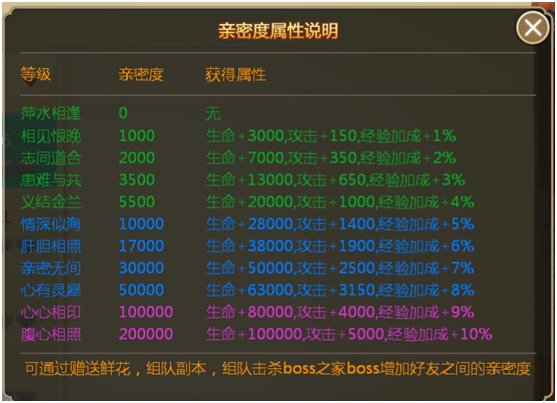 亲密度能够通过赠送鲜花、组队参与副本、组队击杀boss等方式获取,亲密度越高,组队时的加成buff属性也就越强。