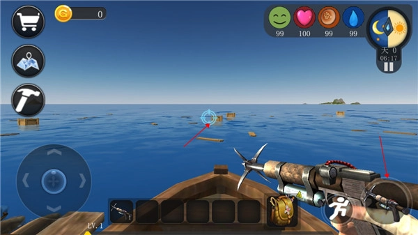 1、游戏开始时,玩家会置身于一条小船上,需要借助手中的标枪来收集物资。操作方法是将准星对准木箱或浮木,然后长按右下角的图标进行发射。