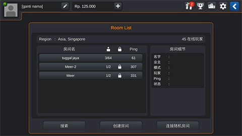 4、选好服务器后,既可以创建房间等候其他玩家加入,也能够选择加入他人已有的房间。