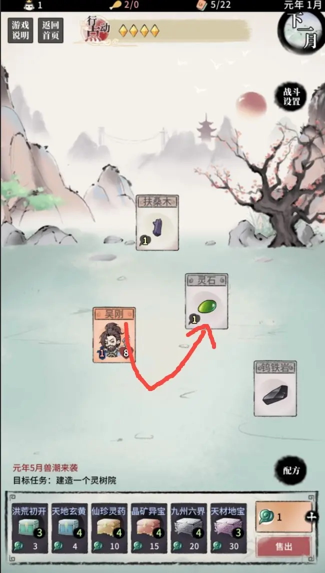 ㉓灵树院:人物1,仙木2,铁矿2,行动点2