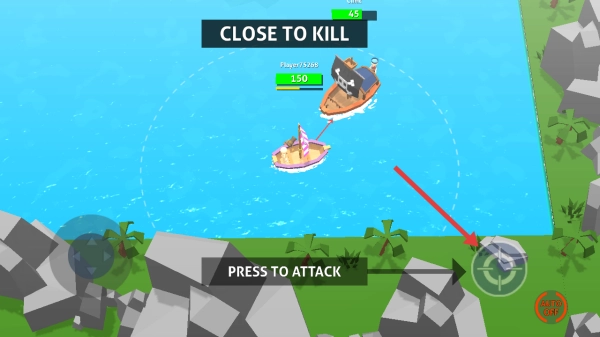3、当靠近敌方船只有CLOSE TO KILL提示时,点击右侧PRESS TO ATTACK按钮,立即发起进攻打击对手。