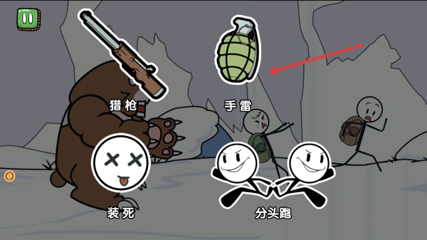 2、遇棕熊后,界面出现猎枪、手雷、装死、分头跑选项,选错,如选分头跑,会触发冒险失败结局。