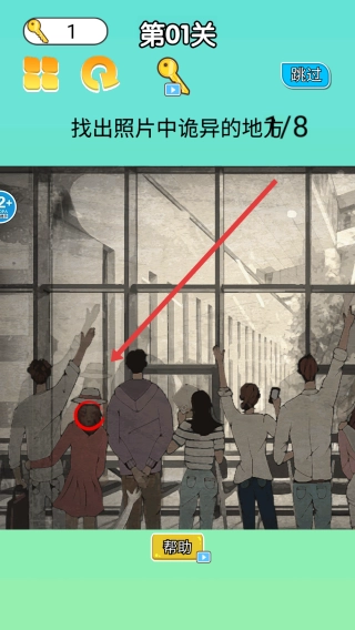 1、进入第01关,观察人群外观,像人物发型、服饰细节,找与正常场景不符的诡异点,头部异常、肢体姿势。