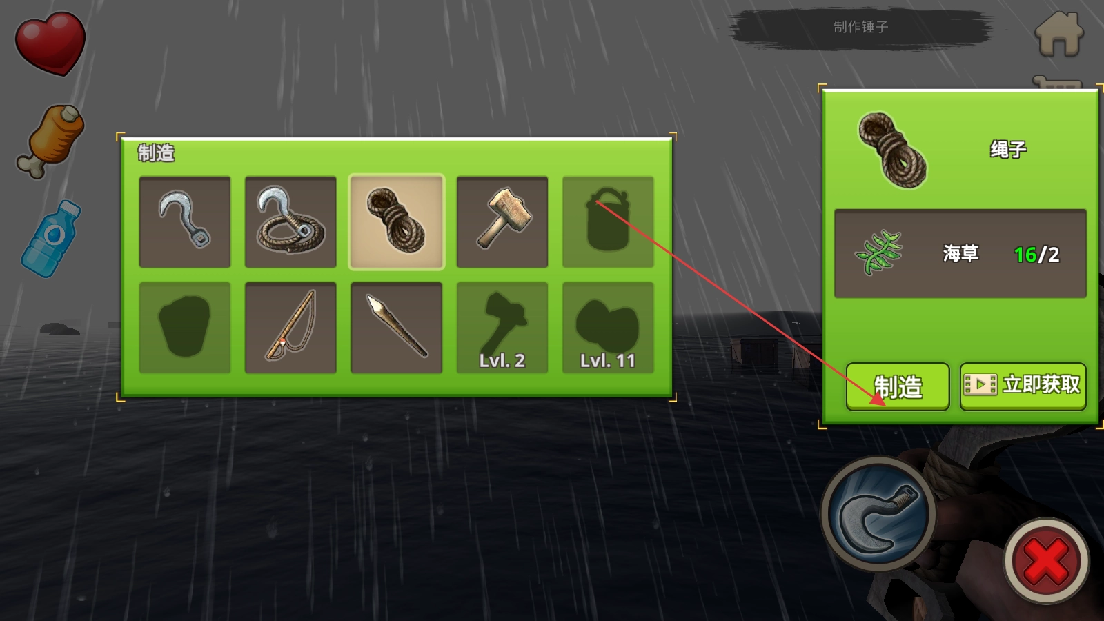 2、采集海草,然后在制造栏中点击【制造】按钮,利用海草合成出绳子之类的工具。