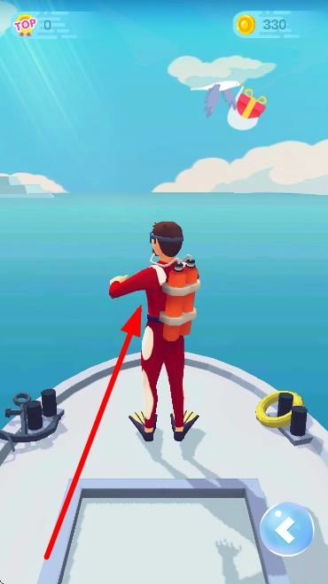1、在初始场景,操控穿红色潜水服的角色,准备潜水,注意上方礼物,可尝试互动获取奖励,然后下水开始比赛。